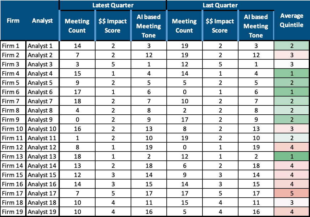 Analysts do more than publish reports-they connect your company to the investment community. Track the quantity and quality of meetings, conferences, and introductions. Not all interactions are equal: prioritize those who bring new investors to the table and foster meaningful engagement.